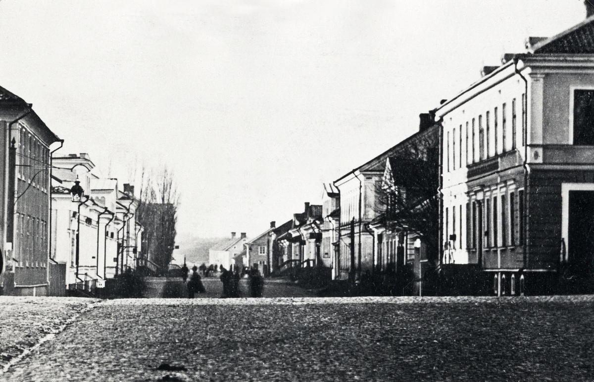 Storgatan, Växjö, från Stortorget, ca 1875. Närmast i bild till vänster kvarteret Unaman, till höger kvarteret Sunaman med bl a regementsläkare Wittlocks fastighet, följt av kvarteret Klostret.