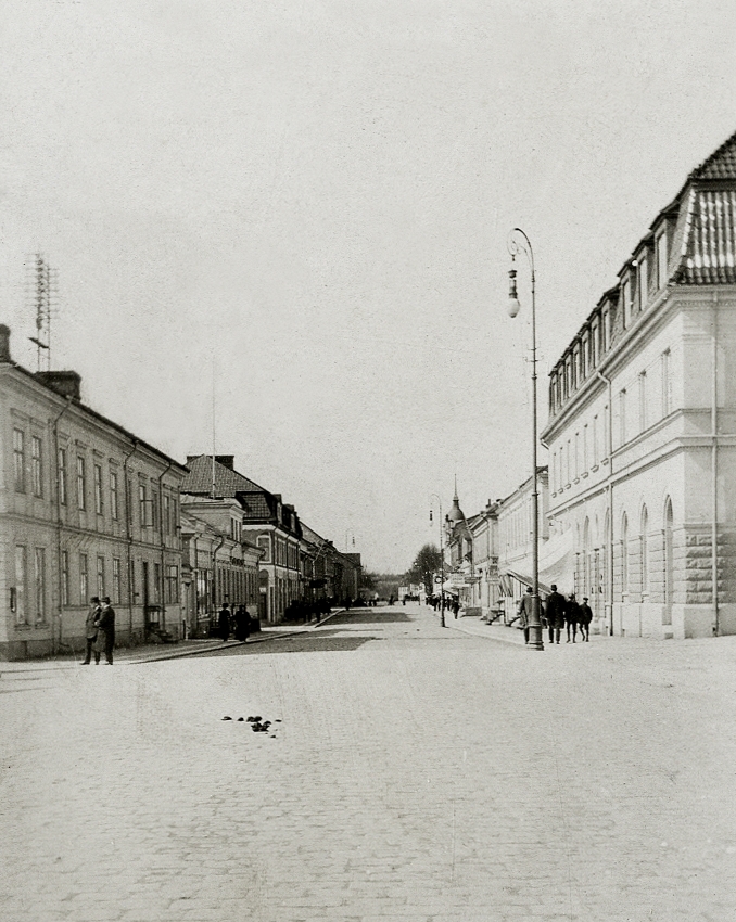Storgatan, Växjö, 1915, västerut. Till vänster ser man några av husen i kvarteret Unaman (P.N. Perssons hörna och
