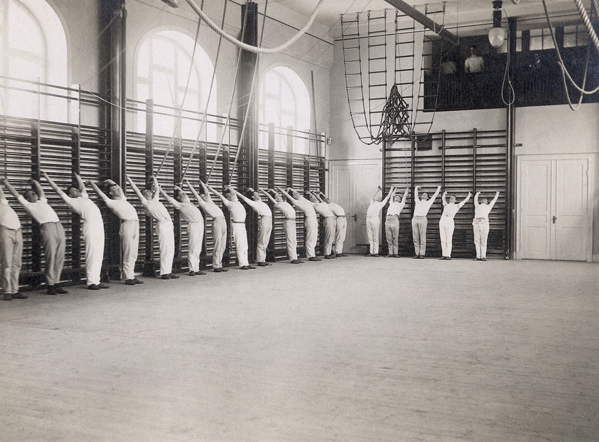 En grupp manliga gymnaster vid ribbstolarna i gymnastiksalen på Ringsbergsskolan, Växjö,