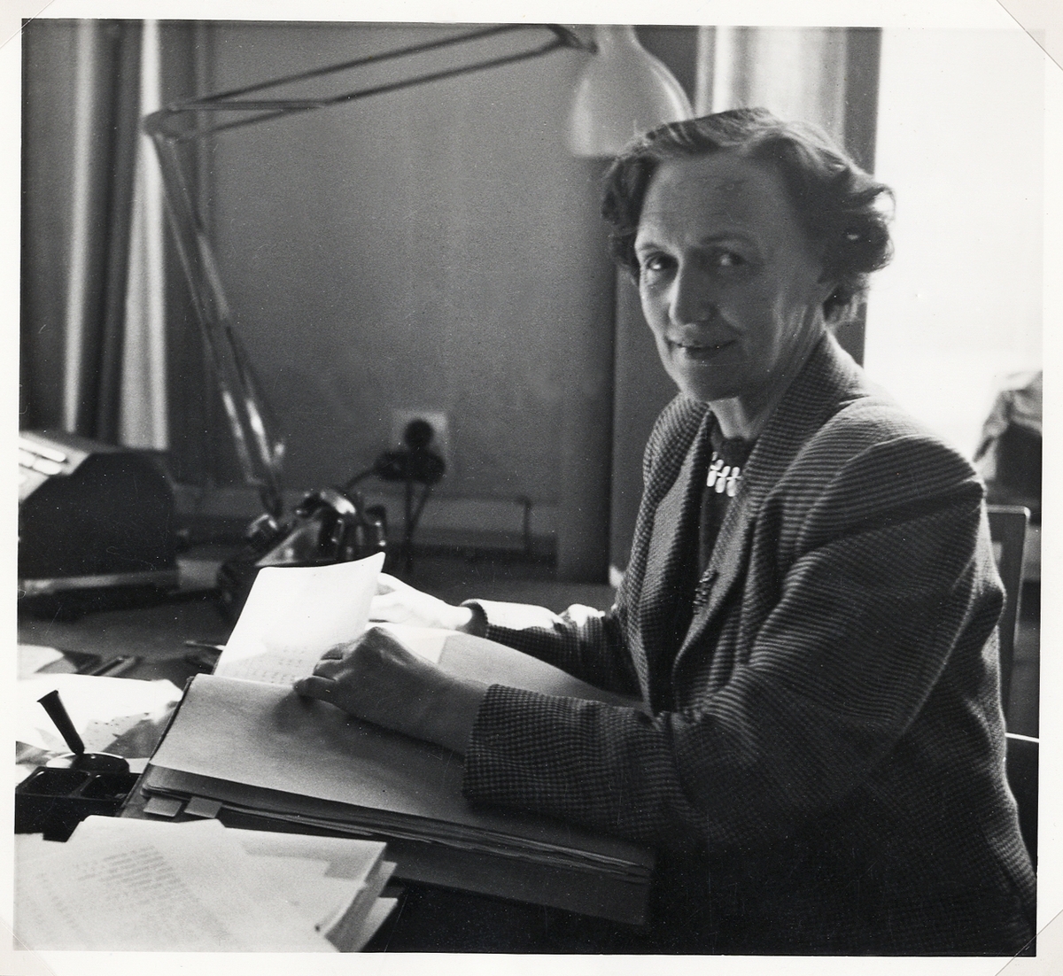 En kvinna i dräkt sitter vid ett skrivbord, ca 1960.