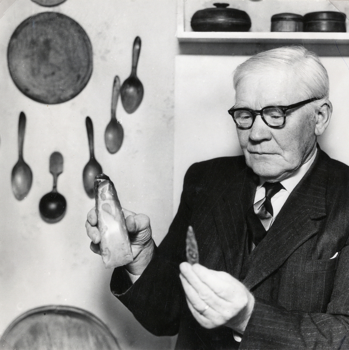 En äldre man i kostym och glasögon visar fram en stenyxa och en pilspets,