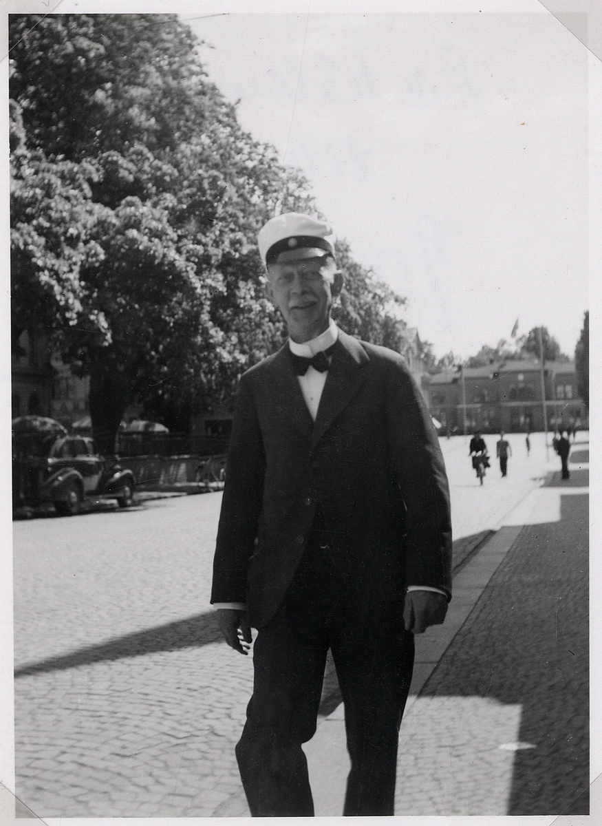 August Johnson ("Jonte"), läroverksadjunkt vid Växjö högre allmänna läroverk 1907-1932, på promenad längs Kungsgatan, ca 1940.