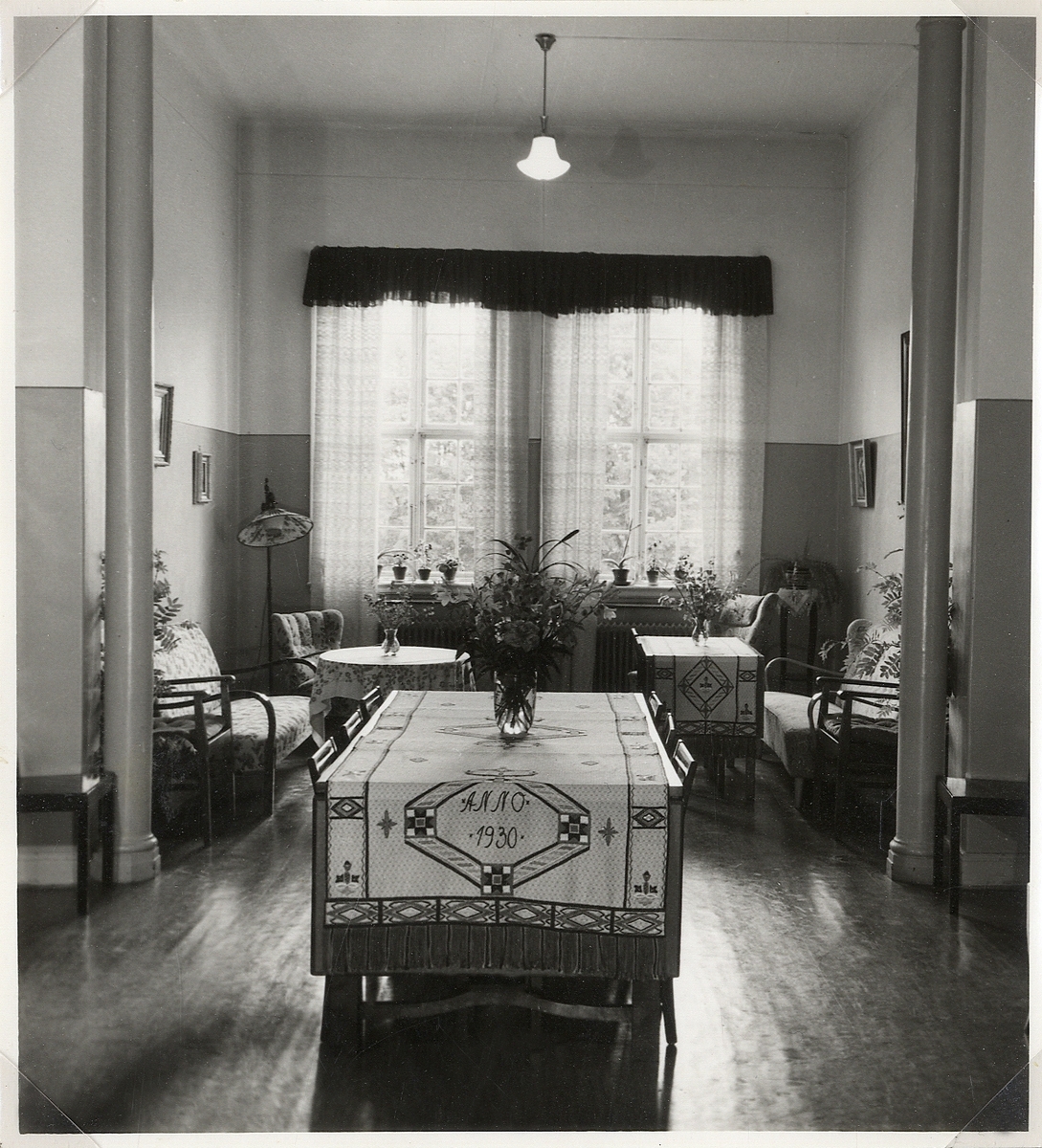 Interiör från samlingssal på dåv. Växjö försörjningsinrättning, Storgatan. Ca 1940.