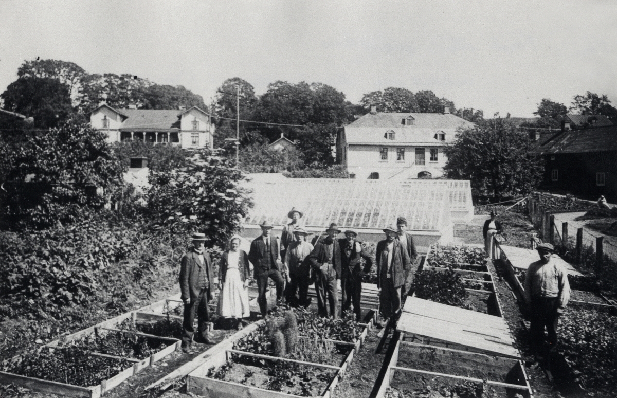 Växjö stads växthus i nuv. Linnéparken, Växjö. Stadsträdgårdsmästare Carl Hjelmberg med personal.