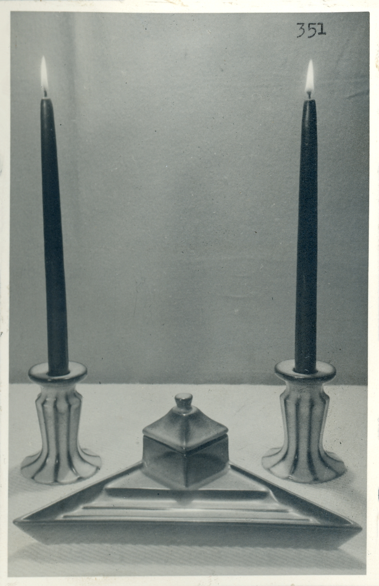 Ljusstakar och skrivställ i konstglasyr Lava från Bo Fajans, formgivare Ewald Dahlskog, 1900-talets mitt.
