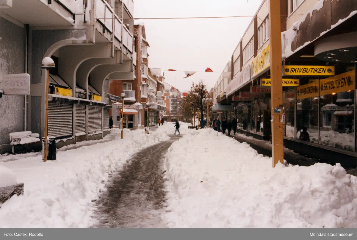 Affärsbyggnader vid Brogatan i Mölndals centrum efter snöstormen den 17 november 1995.