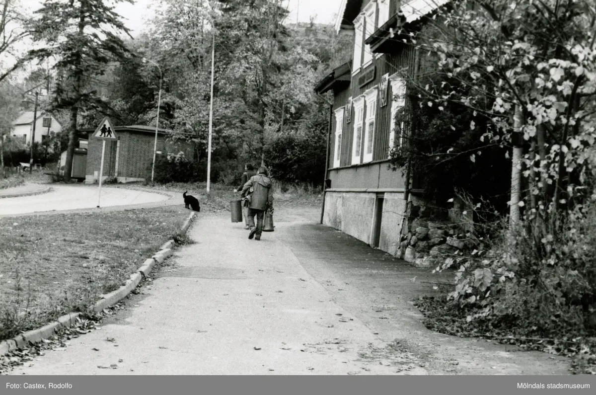 Bebyggelse vid Trädgårdsgatan i Trädgården, Mölndal, år 1988. Två personer och en hund framför huset Trädgårdsgatan 10, även kallat "Klubben". Byggnadsdokumentation inför rivning.