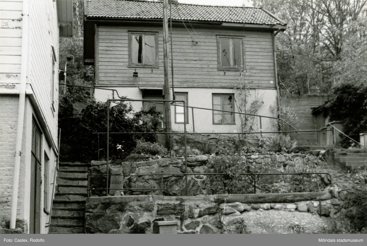 Bostadsbebyggelse vid Trädgårdsgatan i Trädgården, Mölndal, år 1988. Byggnadsdokumentation inför rivning.