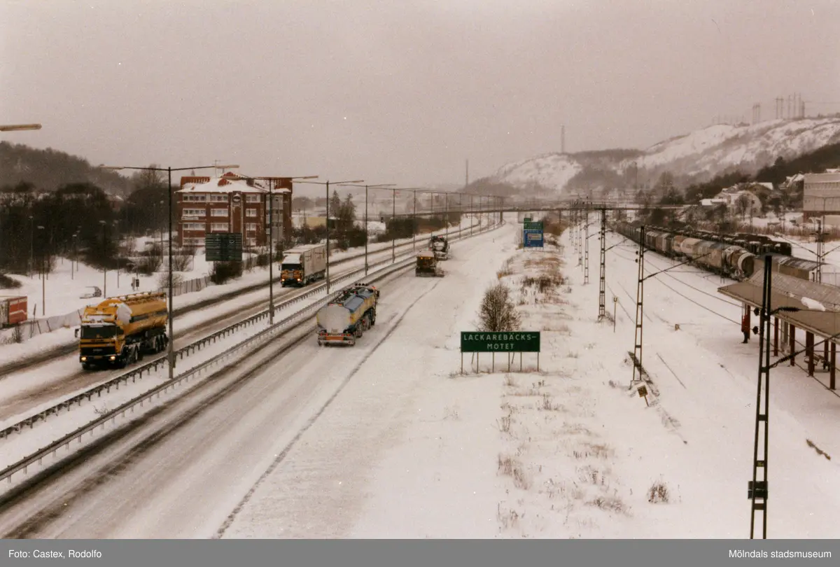 Vy norrut från Mölndals Bro mot trafik på Kungsbackaleden efter snöstormen den 17 november 1995.