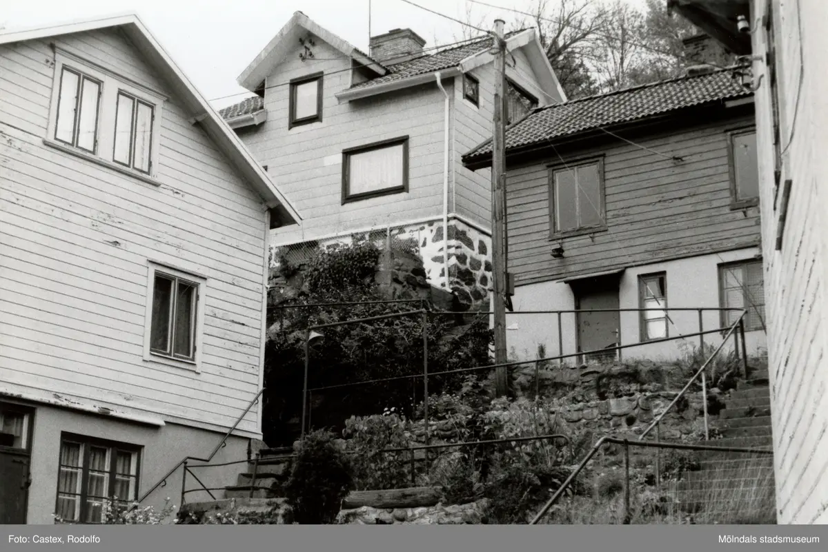 Bostadsbebyggelse vid Trädgårdsgatan i Trädgården, Mölndal, år 1988. Byggnadsdokumentation inför rivning.