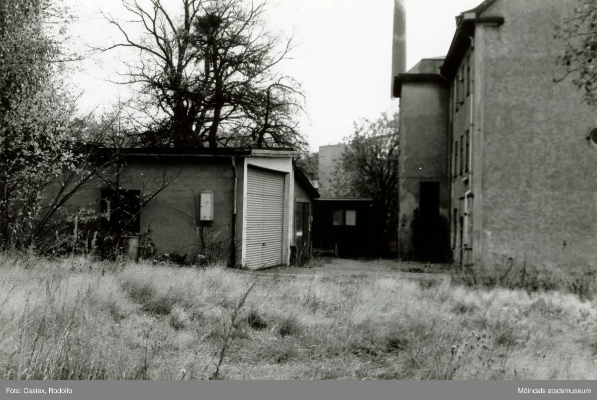 Garage på baksidan av huset Trädgårdsgatan 4 i Trädgården, Mölndal, år 1988. Byggnadsdokumentation inför rivning.