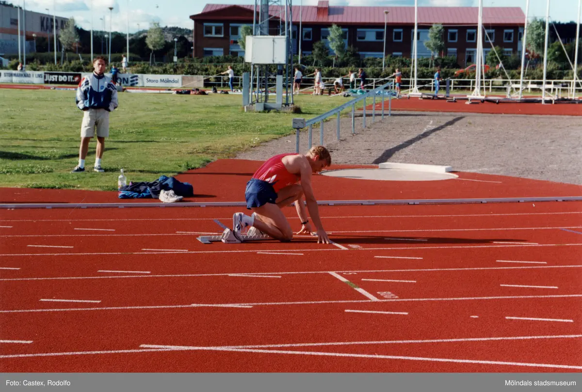 Friidrottsarenan Åby Friidrott i Åby, Mölndal, i juli 1996. En löpare gör sig redo för start.