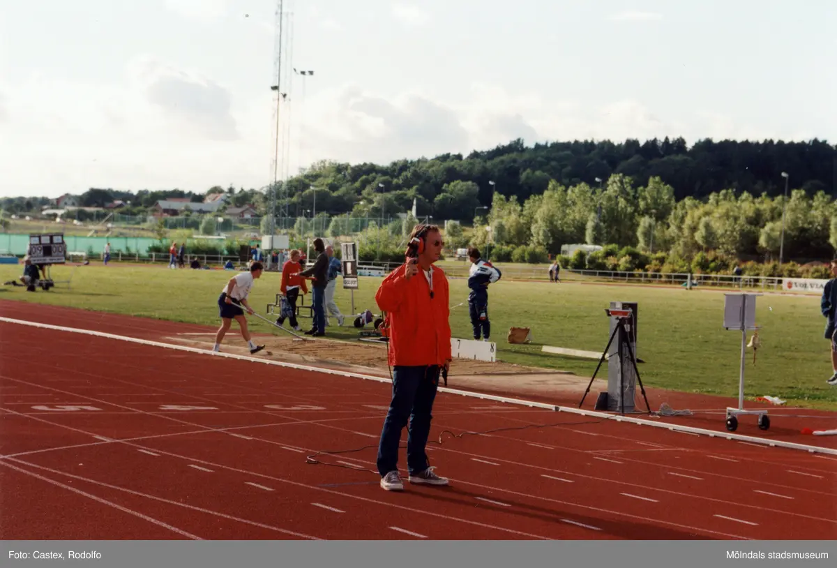 Friidrottsarenan Åby Friidrott i Åby, Mölndal, i juli 1996. En starter är redo att starta loppet.