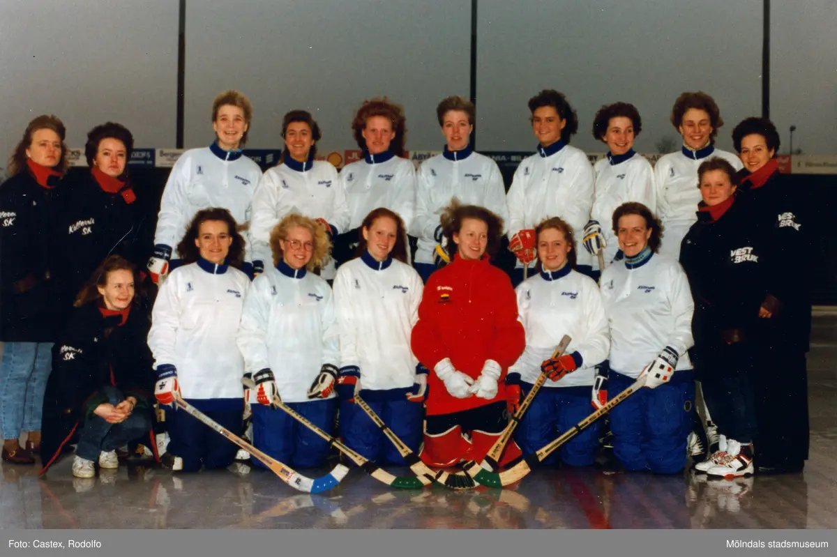 Lagfotografi av Kållereds SK bandydamer, år 1990. Idrottsanläggningen är okänd.