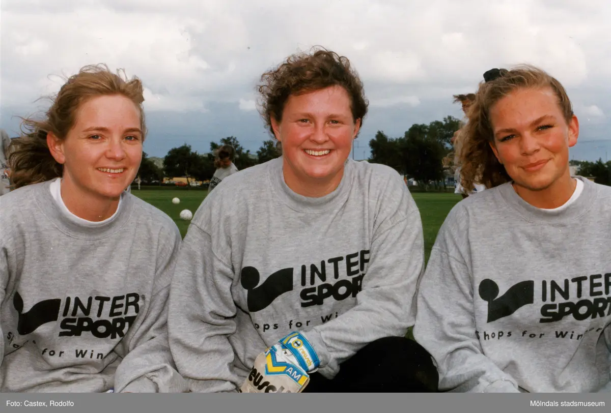 Porträtt av tre Jitex BK-spelare: Camilla Svensson, Eva Larsson och Pernilla Bowall. De tre representerade Sverige i de olympiska spelen i Atlanta 1996. Fotografi taget på Åbyvallen i Åby, Mölndal, samma år.
