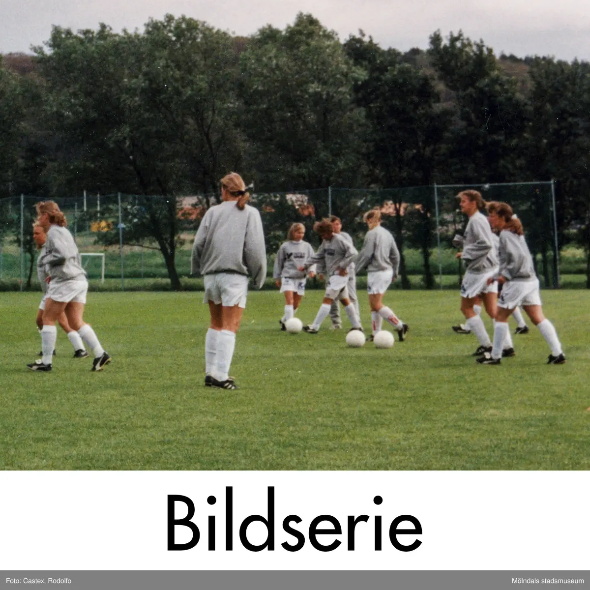 Serie om tre fotografier som visar fotbollslaget Jitex BK träna på Åbyvallen i Åby, Mölndal, år 1996. Även ett porträtt på tre spelare från OS i Atlanta 1996: Camilla Svensson, Eva Larsson samt Pernilla Bowall.
