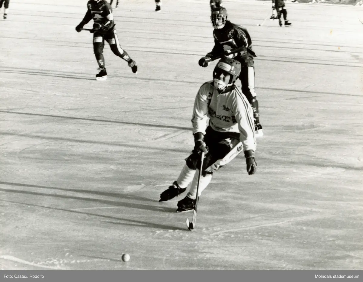 Bandylaget Fässberg/Fellows BK spelar match på Åby isstadion i Mölndal, okänt årtal. Spelaren närmast kameran kan vara Ulf Grönroos.