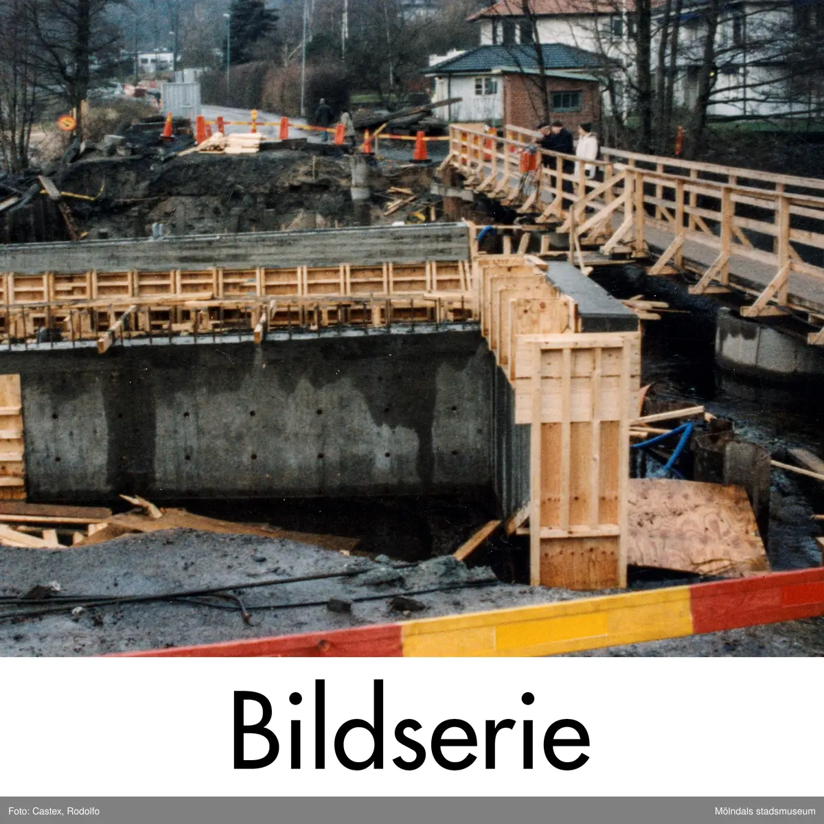 Serie om fyra fotografier som visar byggnationen av Gunnebo Bro vid Stensjön i Mölndal, år 1998.