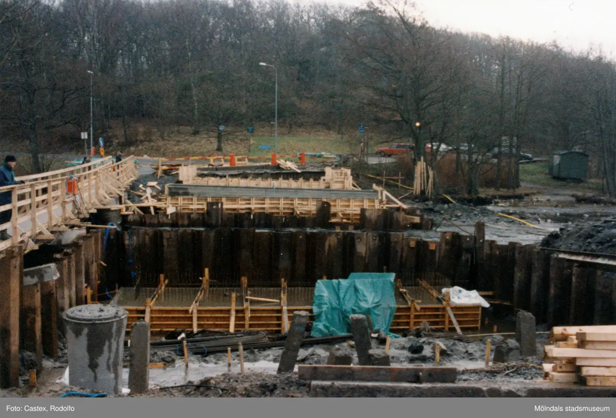 Byggnationen av Gunnebo Bro vid Stensjön i Mölndal, år 1998.
