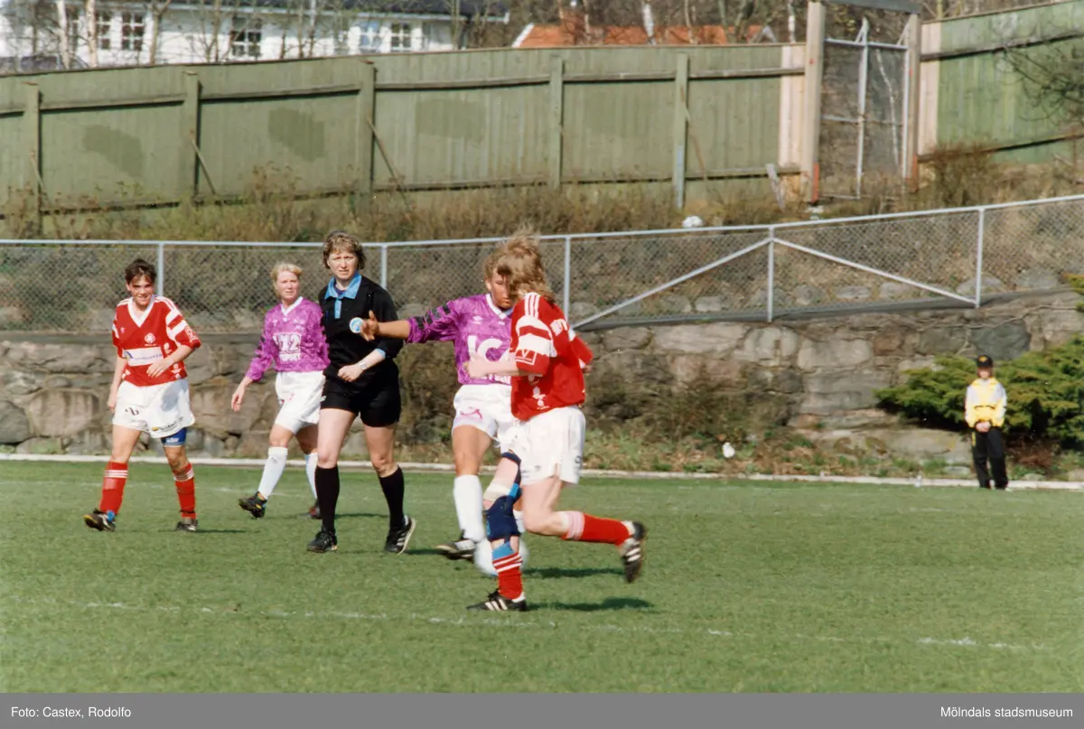 Fotbollslaget Jitex BK spelar match mot Mallbackens IF på Kvarnbyvallen i Mölndal, april 1993. Matchen slutade 2-1.