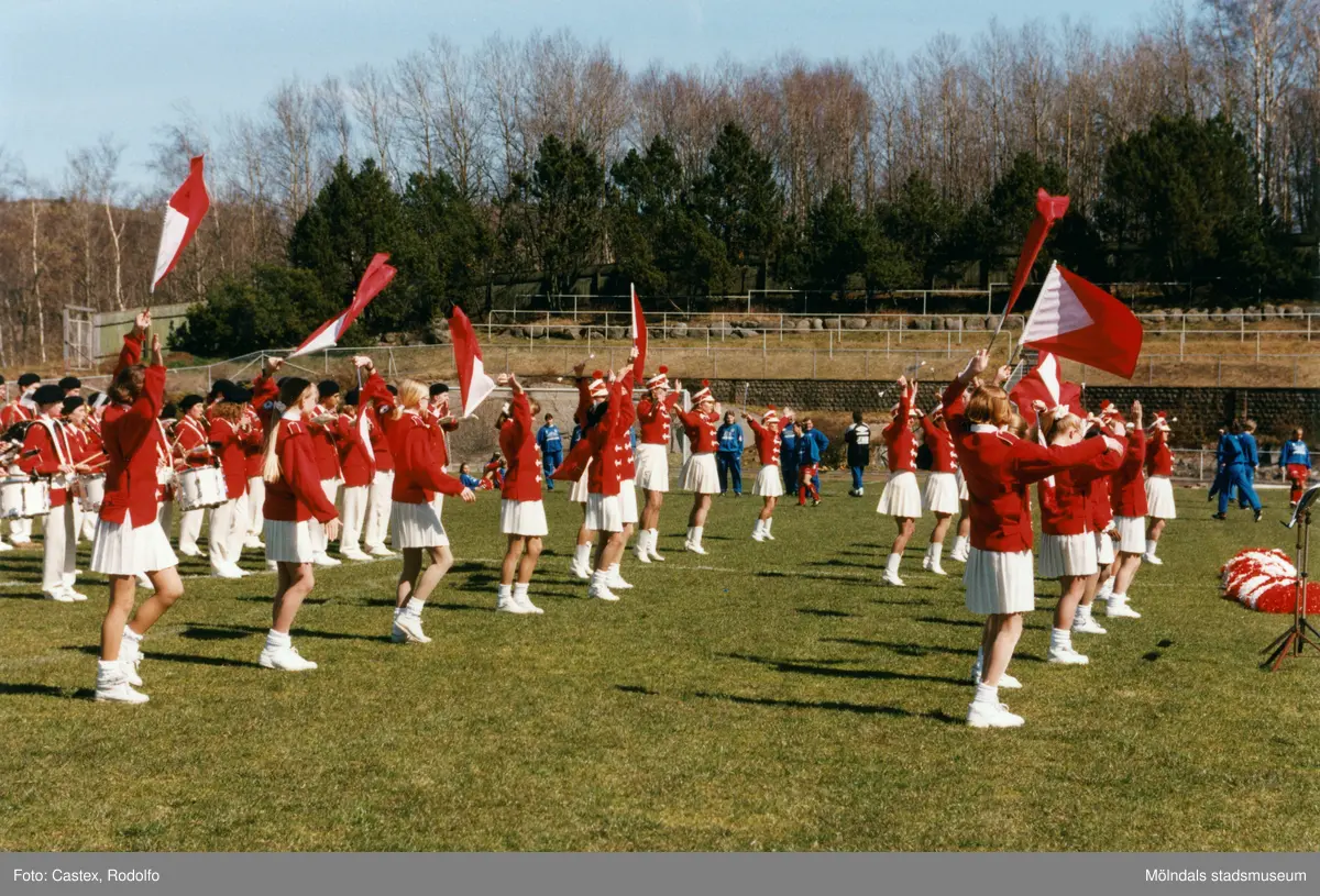 Kvarnbyvallen i Mölndal, år 1997. Mölndals Paradorkester underhåller på fotbollsplanen.