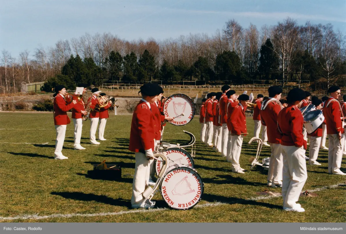 Kvarnbyvallen i Mölndal, år 1997. Mölndals Paradorkester underhåller på fotbollsplanen.