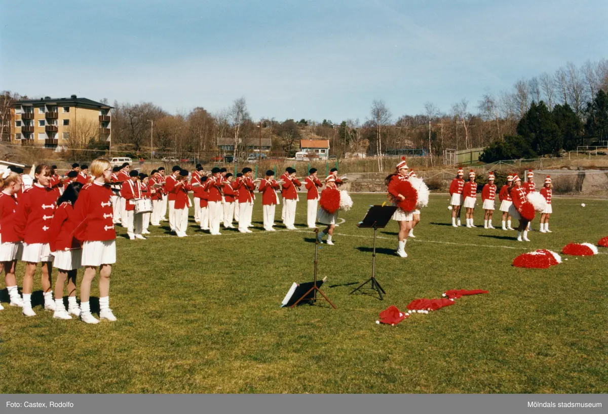 Kvarnbyvallen i Mölndal, år 1997. Mölndals Paradorkester underhåller på fotbollsplanen.