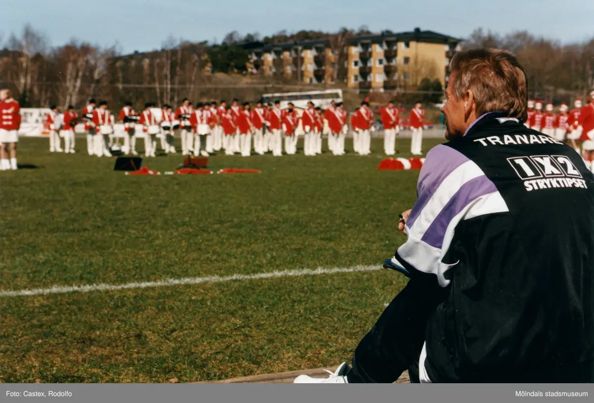 Kvarnbyvallen i Mölndal, år 1997. Mölndals Paradorkester underhåller på fotbollsplanen. En fotbollstränare sitter och tittar på.