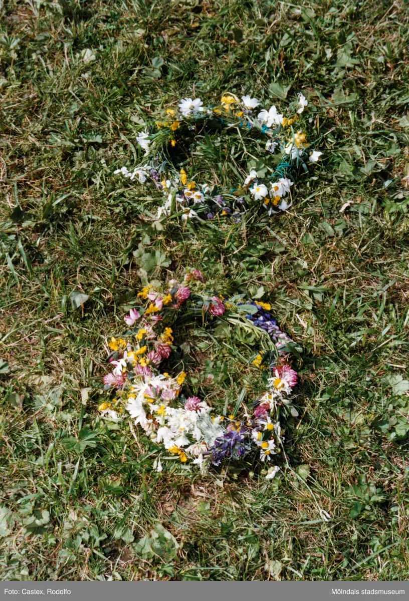 Midsommarfirande vid Gunnebo slott i Mölndal, den 20 juni 1997. Två blomsterkransar ligger i gräset.