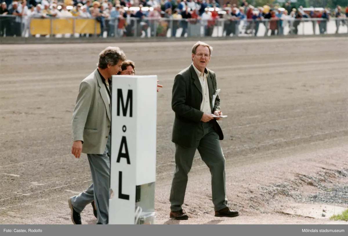 En kvinna och två män promenerar över travbanan strax intill mållinjen på Åbytravet i Åby, Mölndal, den 19 september 1998.
