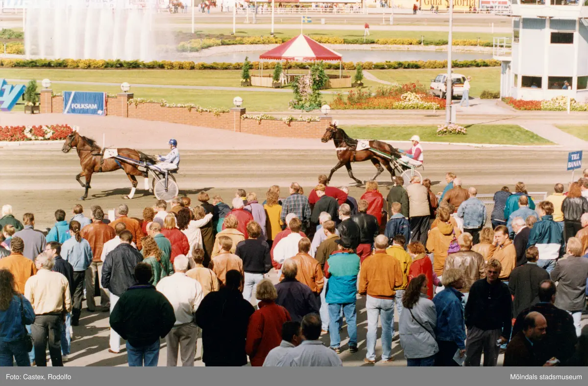 Publiken följer travloppet Åby Stora Pris på Åbytravet i Åby, Mölndal, hösten 1993.