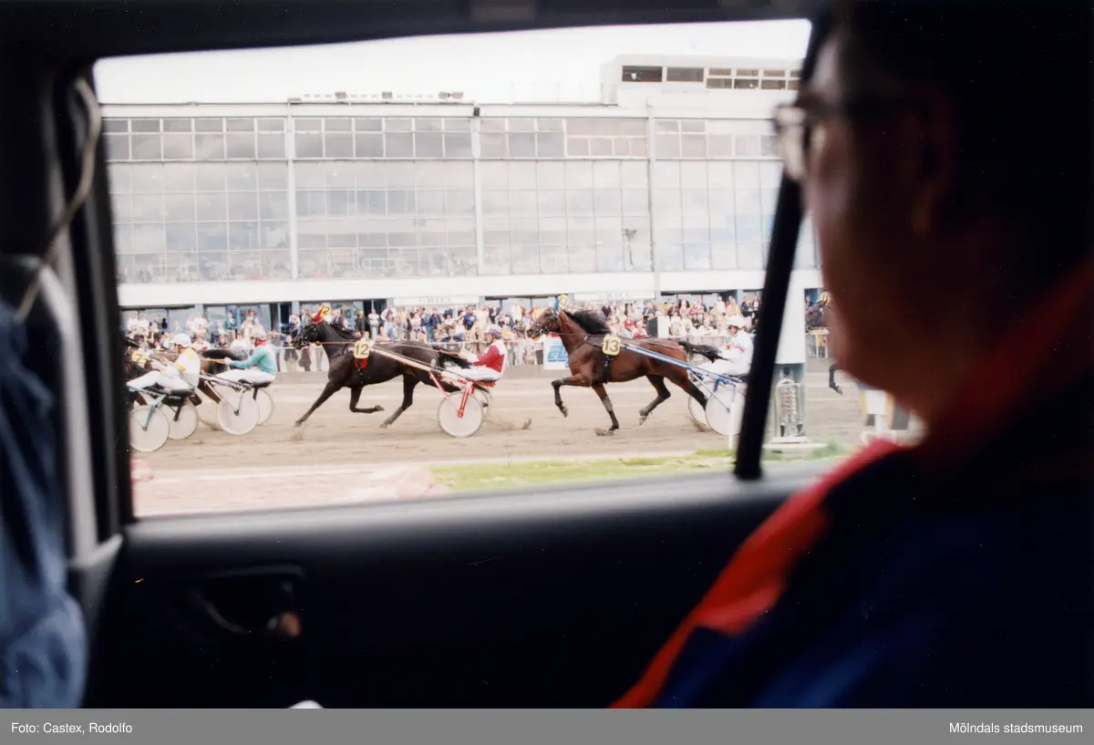 En man följer ett travlopp från en domarbil på Åbytravet i Åby, Mölndal, den 19 september 1998.