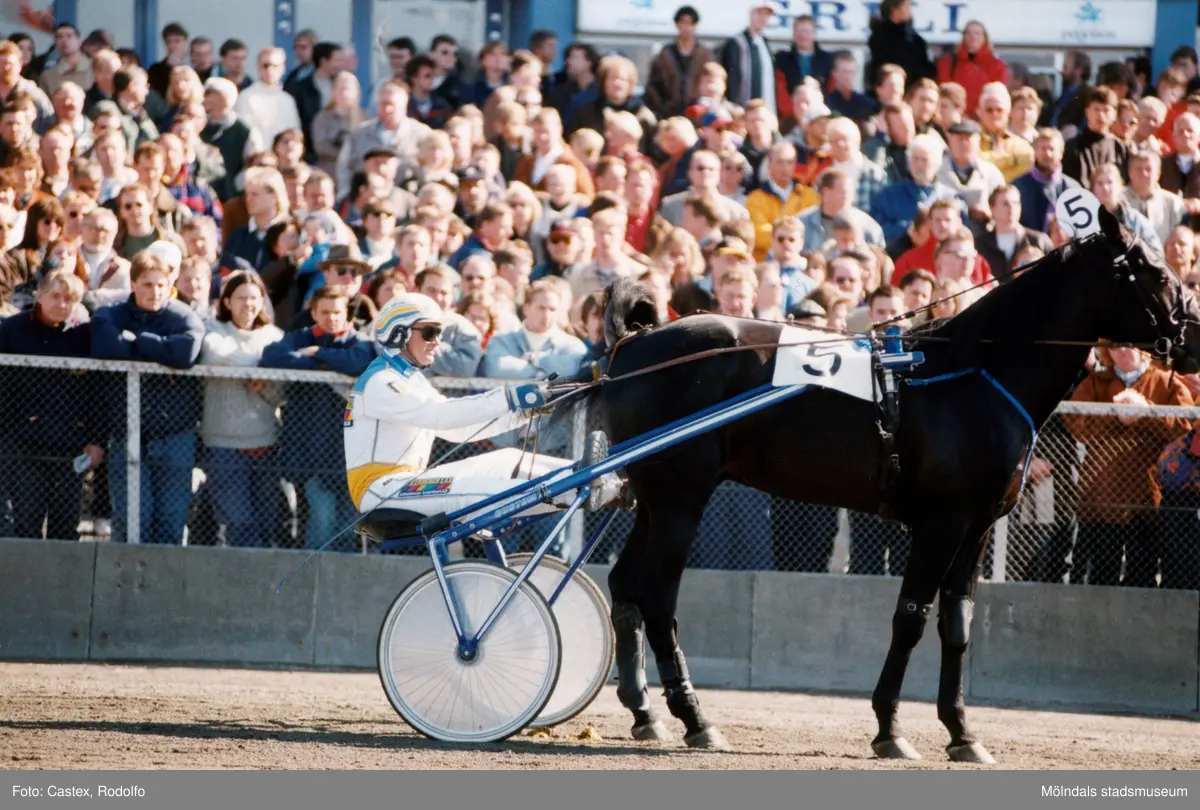 Travloppet Olympiatravet på Åbytravet i Åby, Mölndal, den 13 april 1996. Ett travekipage på travbanan. Segrade gjorde Erik Berglöf med Copiad.