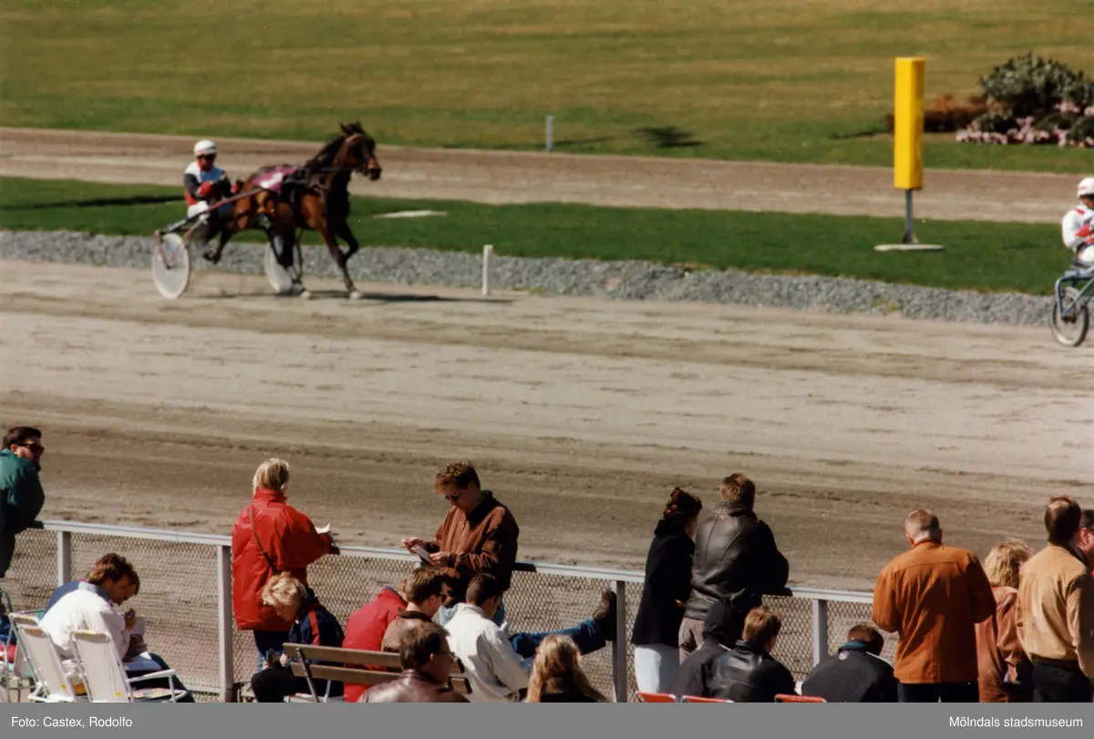 Publik som följer lopp på Åbytravet i Åby, Mölndal, under travloppet Drottning Silvias Pokal, lördagen den 3 maj 1997.