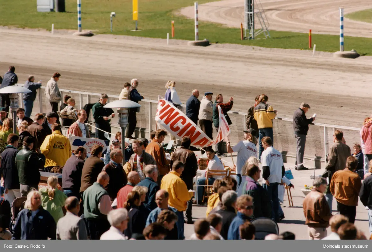 Titel: Publik som följer lopp på Åbytravet i Åby, Mölndal, under travloppet Drottning Silvias Pokal, lördagen den 3 maj 1997.