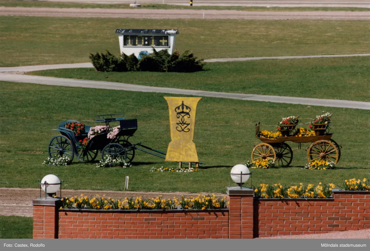 Blomsterutsmyckade vagnar vid innerplan på Åbytravet i Åby, Mölndal, under travloppet Drottning Silvias Pokal, lördagen den 3 maj 1997.