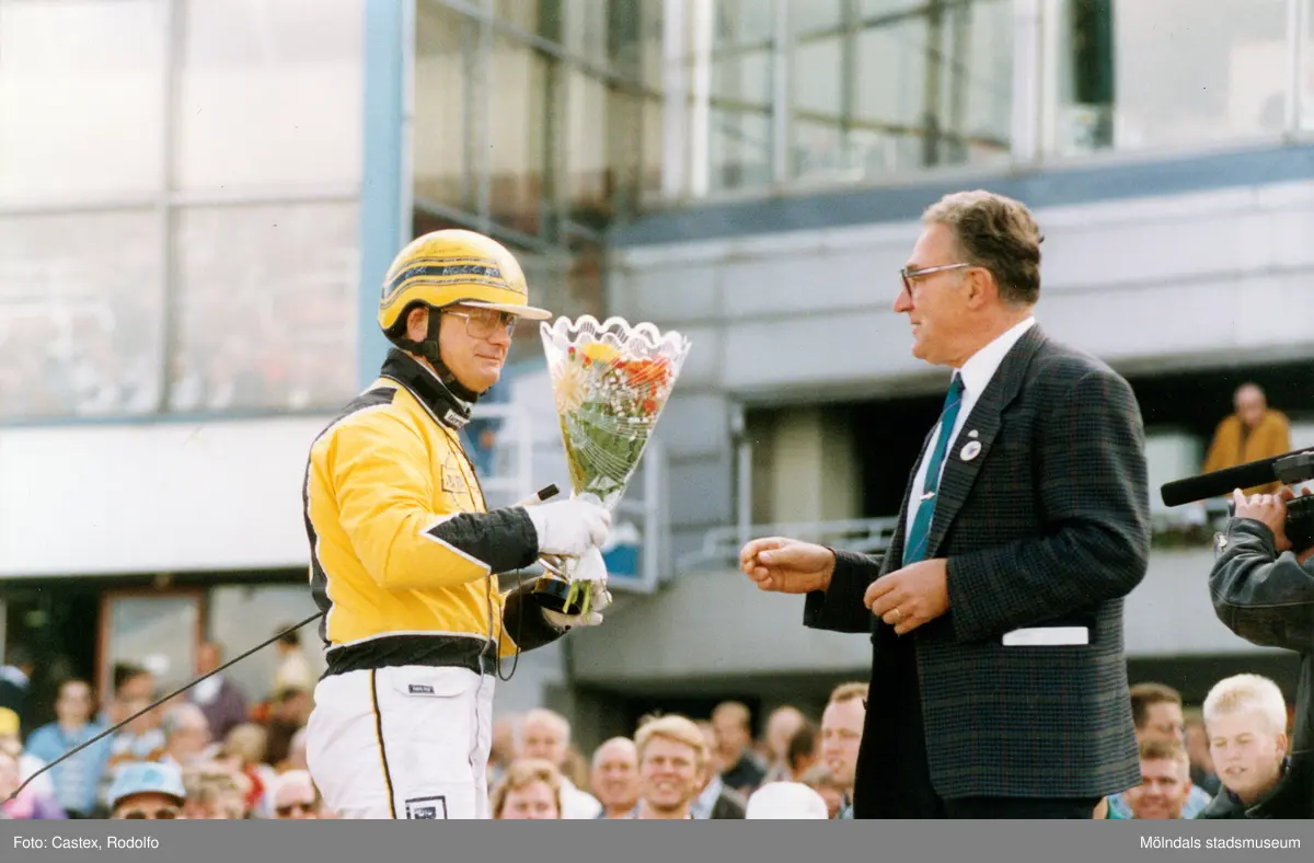 Prisutdelning till den segrande travkusken av travloppet Åby Stora Pris på Åbytravet i Åby, Mölndal, hösten 1993.