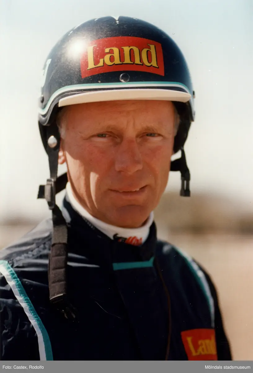Porträtt av travkusken Stig H. Johansson i samband med travloppet Drottning Silvias Pokal på Åbytravet i Åby, Mölndal, lördagen den 3 maj 1997.