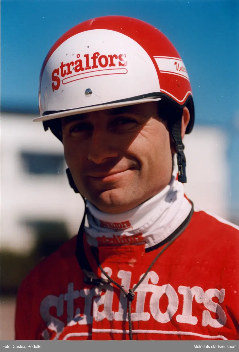 Titel: Porträtt av en travkusk i samband med travloppet Drottning Silvias Pokal på Åbytravet i Åby, Mölndal, lördagen den 3 maj 1997.