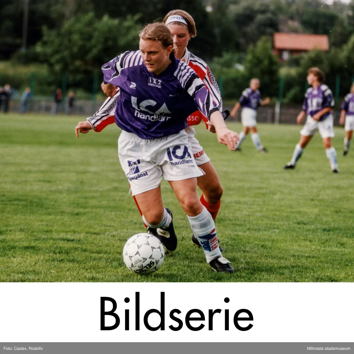 Serie om fem fotografier som visar fotbollslaget Jitex BK spela match mot Landvetter IF på Kvarnbyvallen i Mölndal, år 1996. I samband med matchen delas blombuketter ut till Jitex-spelarna Pernilla Bowall, Eva Larsson och Camilla Svensson. Matchen slutade 1-1.