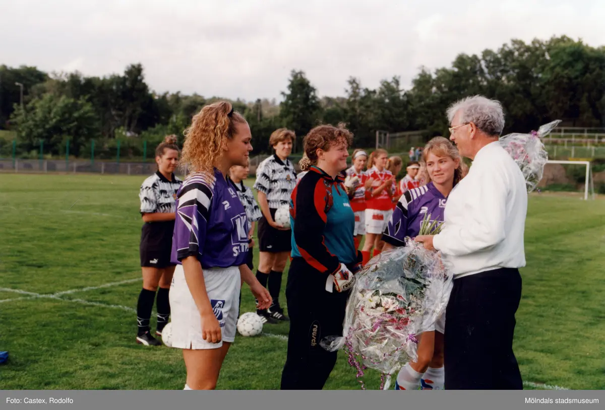 Kvarnbyvallen i Mölndal, år 1996. I samband med en fotbollsmatch mellan Jitex BK och Landvetter IF delas blombuketter ut till Jitex-spelarna Pernilla Bowall, Eva Larsson och Camilla Svensson. Matchen slutade 1-1.