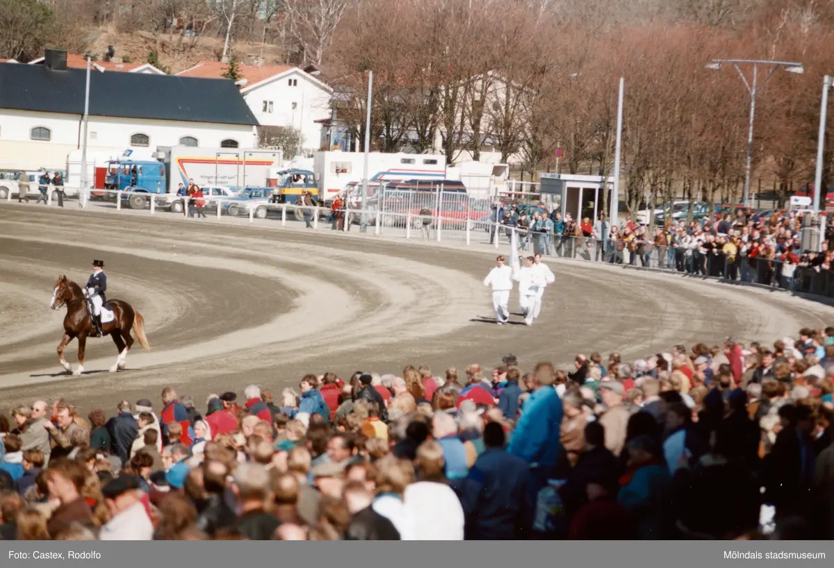 Bordtennisspelaren Jan-Ove Waldner springer på banan med den olympiska elden i samband med travloppet Olympiatravet på Åbytravet i Åby, Mölndal, den 13 april 1996.