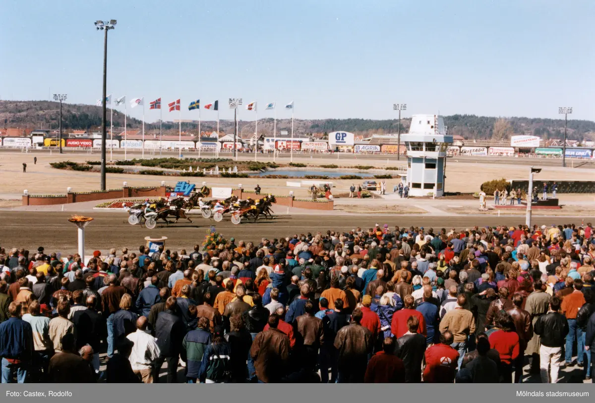 Ett travlopp i samband med Olympiatravet på Åbytravet i Åby, Mölndal, den 13 april 1996.
