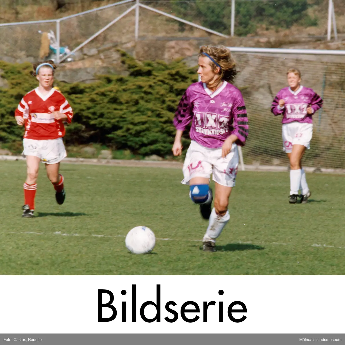Serie om 10 fotografier som visar fotbollslaget Jitex BK spela match mot Mallbackens IF på Kvarnbyvallen i Mölndal, april 1993. Matchen slutade 2-1. Även ett lagfotografi av Jitex BK, taget vid samma tillfälle.