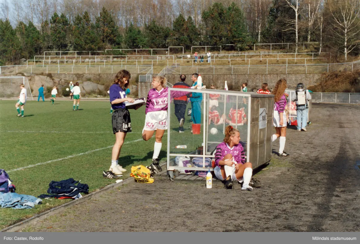 Fotbollslaget Jitex BK spelar match mot Mallbackens IF på Kvarnbyvallen i Mölndal, april 1993. Jitex-spelare vid sidan av planen. Matchen slutade 2-1.