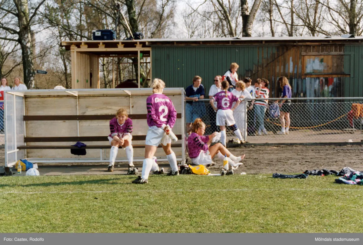 Fotbollslaget Jitex BK spelar match mot Mallbackens IF på Kvarnbyvallen i Mölndal, april 1993. Jitex-spelare vid sidan av planen. Matchen slutade 2-1.