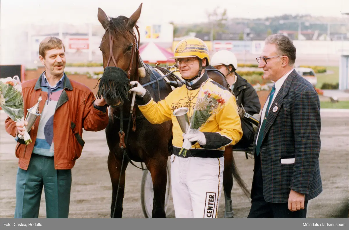 Det segrande travekipaget ute på banan efter prisutdelning för vinsten i travloppet Åby Stora Pris på Åbytravet i Åby, Mölndal, hösten 1993.