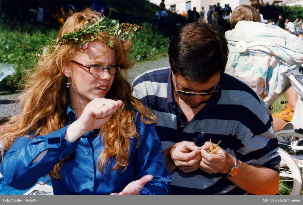 Midsommarfirande vid Gunnebo slott i Mölndal, den 20 juni 1997. Porträtt av en par. Kvinnan har en blomsterkrans på huvudet.
