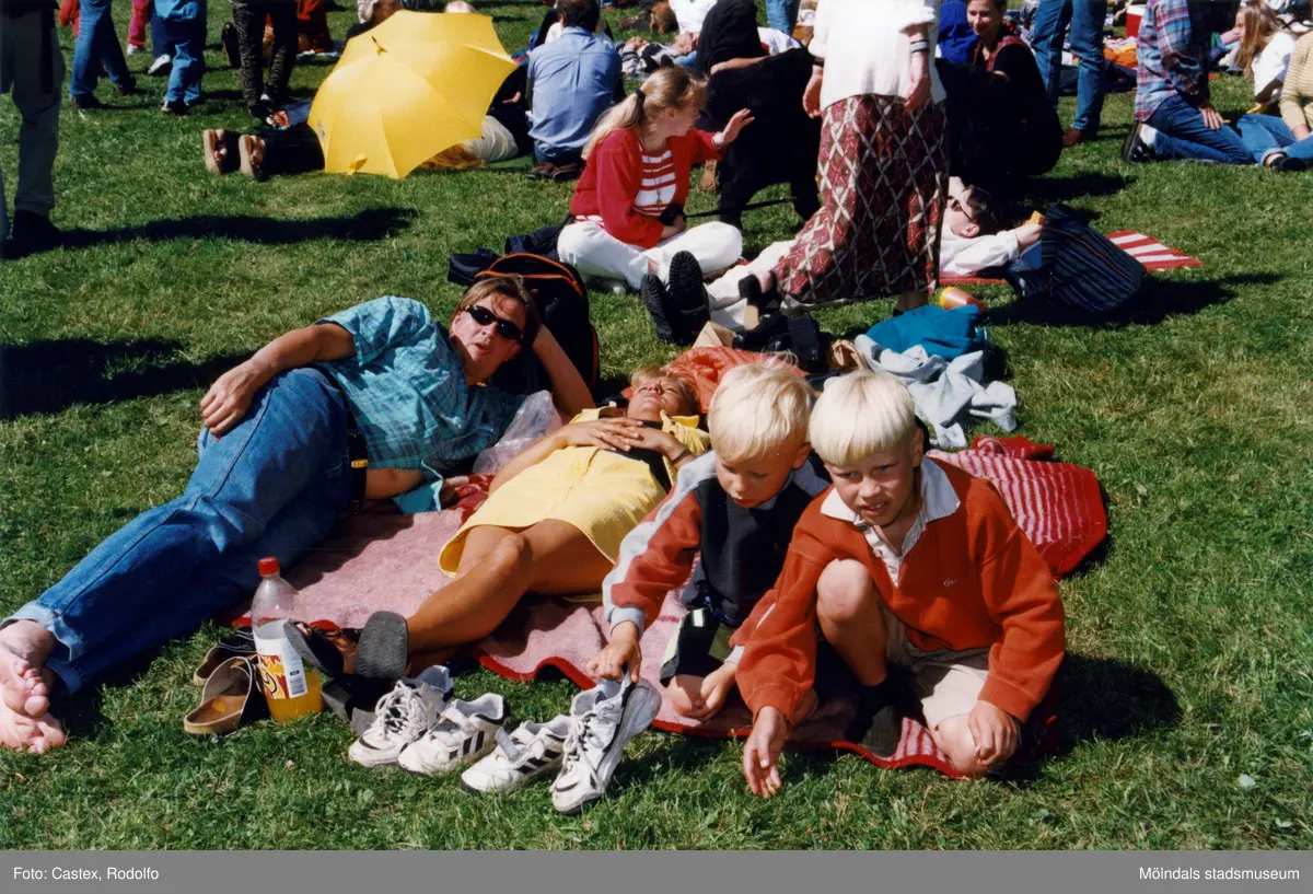 Midsommarfirande vid Gunnebo slott i Mölndal, den 20 juni 1997. En familj som hittat sin plats på gräsmattan.