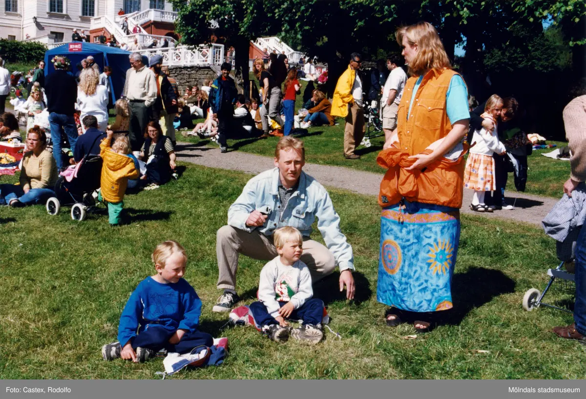 Midsommarfirande vid Gunnebo slott i Mölndal, den 20 juni 1997. En familj som hittat sin plats på gräsmattan.